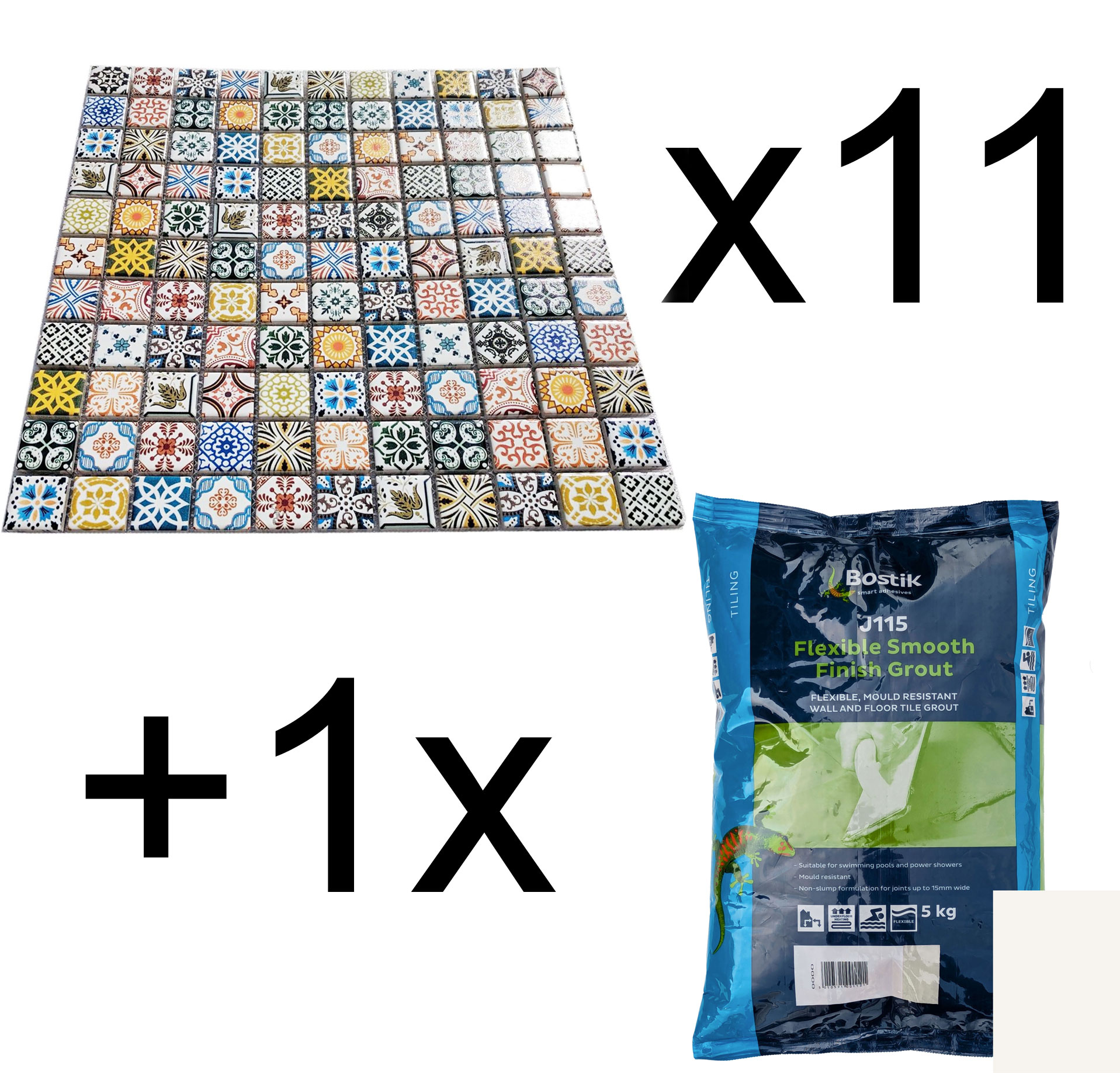 This special offer listing is for 11x mosaic tiles + 1x 5kg bag of Jasmine (very light yellow) colour powdered grout.