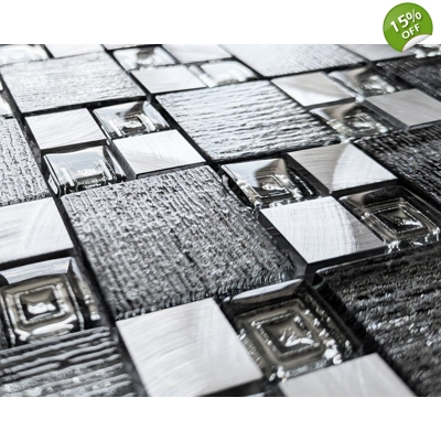Silver Chrome Metal & Light Foil Glass Grey Square Mosaic Wall Tile